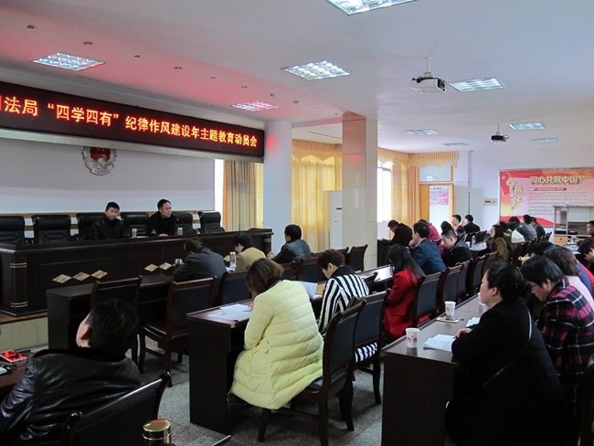 会上,党组书记、局长陈兵同志作了动员讲话。他指出,在思想意识层面,要深刻认识到主题教育的重大意义。开展“四学四有”纪律作风建设年主题教育,是确保党和国家重大决策部署在全县司法行政系统得到不折不扣贯彻执行的重要举措,是全面从严治党向基层延伸、建立“两学一做”常态化长效化机制的有效载体,是深化严格规范公正文明执法的重要基础,是落实中央、市委、县委巡视督查重点整改任务、推进司法行政改革攻坚的有力保障。在工作推进层面,要把握学什么、怎么学两个重点,保证主题教育有力有序有效开展;要学习党章党规,做到心中有党不忘恩;学习典范典型,做到心中有名不忘本;学习法律法规,做到心中有责不懈怠;学案例事例,做到心中有戒不忘为;通过深入主题教育,要使全体干部职工普遍受到一次思想政治纪律作风的深刻教育,增强践行“四个意识”特别是核心意识、看齐意识的思想自觉和行动自觉,在思想上认同、政治上维护、行动上紧跟以习近平同志为核心的党中央;要以自我教育、自我对照、自我剖析、自我整改、自我提高为主线,以教育、监督、查处、追责为立足点,深入查找并切实解决司法行政队伍在作风纪律方面存在的突出问题。?在谈到如何确保学习教育取得实效时,陈兵局长强调,一要加强组织领导,层层落实责任,确保主题教育有人抓、有人管。二要领导带头示范,当好主题教育的表率。三要加强指导、强化督查,确保主题教育不走过程。四要坚持两手抓,两结合。五要加强宣传,营造氛围。?